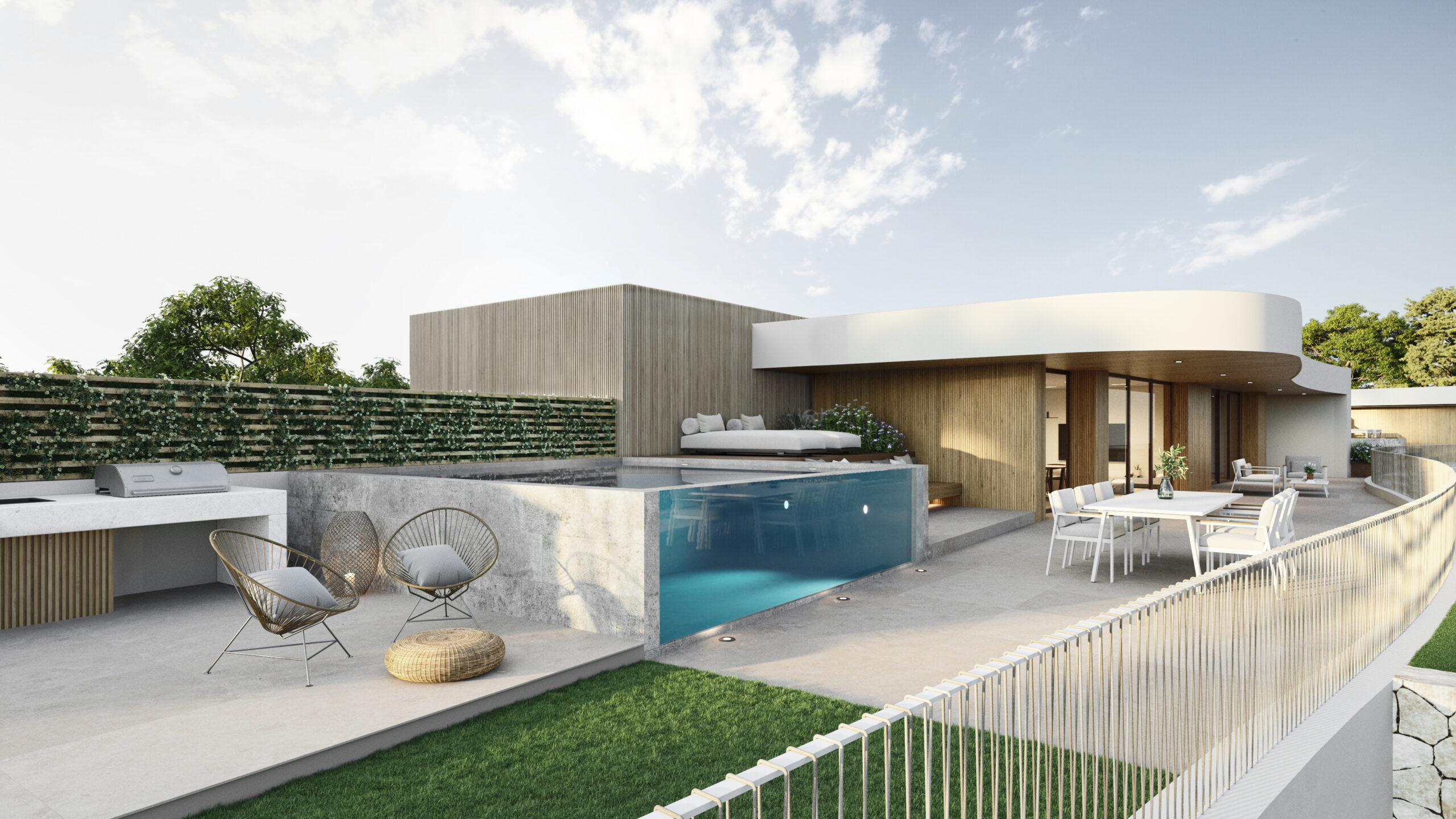 con zonas claramente diferenciadas y una terraza de más de 55 m2 como prolongación del interior, rompiendo los límites entre Interior – Exterior y una piscina privada desde la que disfrutar de las vistas del Mediterráneo más salvaje. Al otro lado del salón hay una zona de barbacoa cubierta.